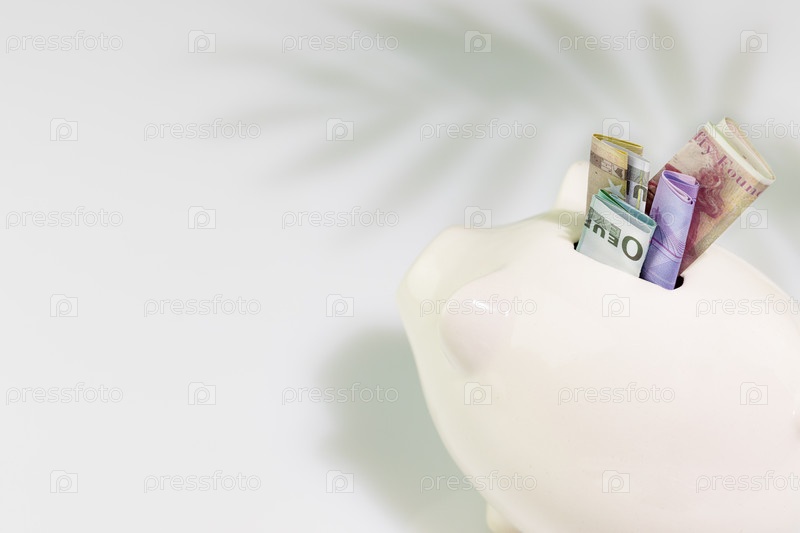 Белый пигги-банк с банкнотами разных стран на синем фоне с тенью пальмы и копировальным пространством. Концепция сбережений и инвестиций. Мягкий трюк