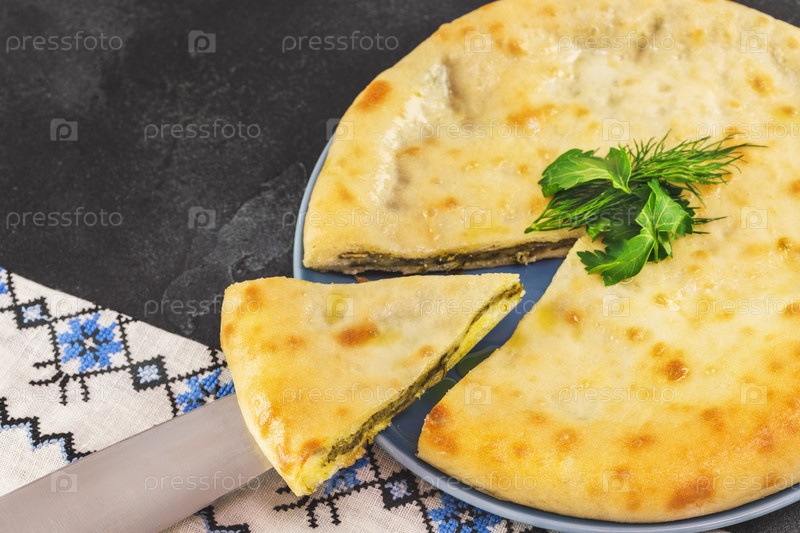 Домашний свежевыпеченный осетинский пирог со шпинатом, оливковым маслом, петрушкой и уксусом на черном фоне с копировальным пробелом