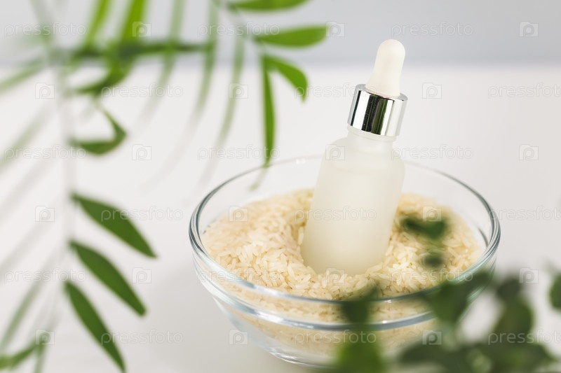 Ферментированный уход за красотой.Уэлнес-композиция с ручкой, изготовленная из рисовой воды и рисовых зерен в стеклянной таре на белом столе с пальмовыми листьями.Природные домашние косметические средства на основе ферментированного продукта
