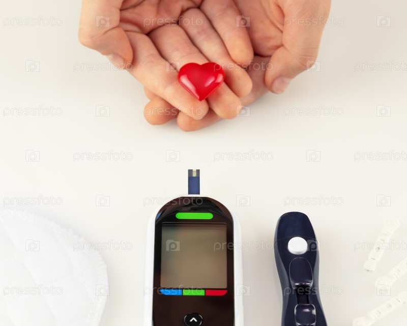 Концепция диабетического заболевания с глюкометром, полосками для анализа сахара в крови, ланцетами и детскими руками с декоративным сердцем