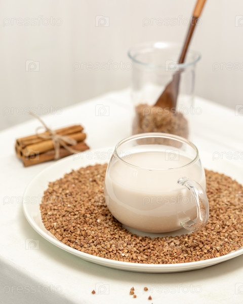 Не лактозное гречневое молоко. Веганская композиция пищи со стаканчиком растительного молока с грецкими хлопьями и палочками корицы на белом столе. Веганские здоровые молочные продукты