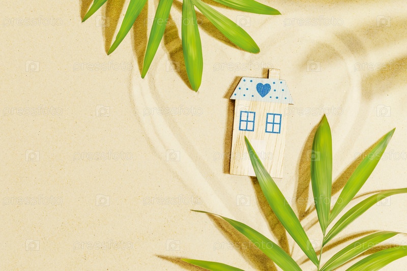 Сердце нарисовано на пляжном песке под тенью пальмовых листьев с декоративным деревянным домом.Концепция покупки или аренды недвижимости в экзотических странах.Летние каникулы