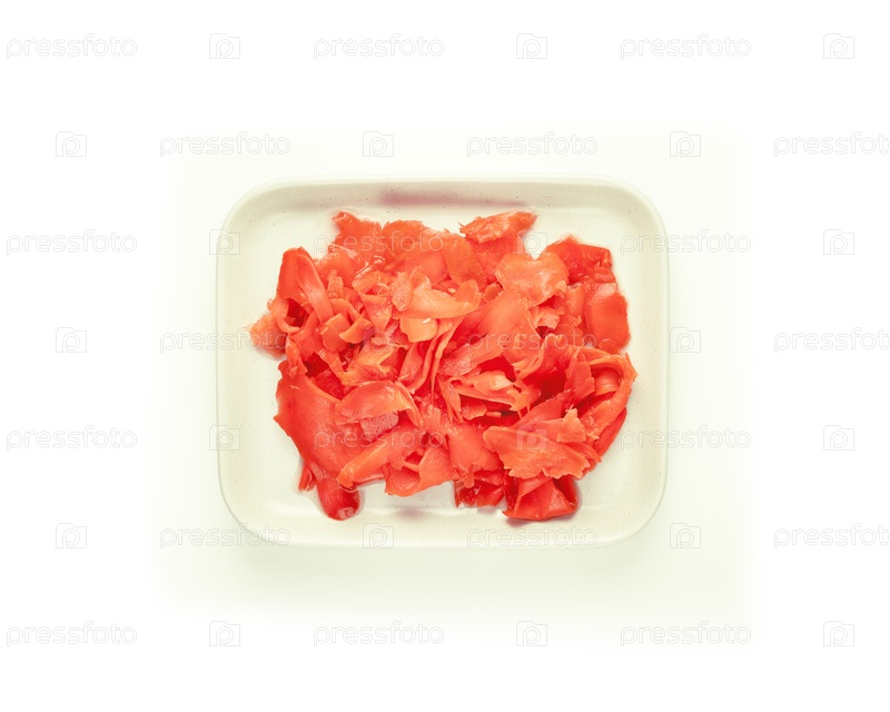 Изолированный красноочищенный имбирь на белой фарфоровой тарелке