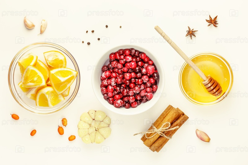 Иммунная стимуляция пищи.Здоровый состав продуктов питания с дикими клюквами, медом, чесноком, морской гречневой косточкой, палочками корицы и пряностями на белом фоне.Вирус побеждает природные ингредиенты