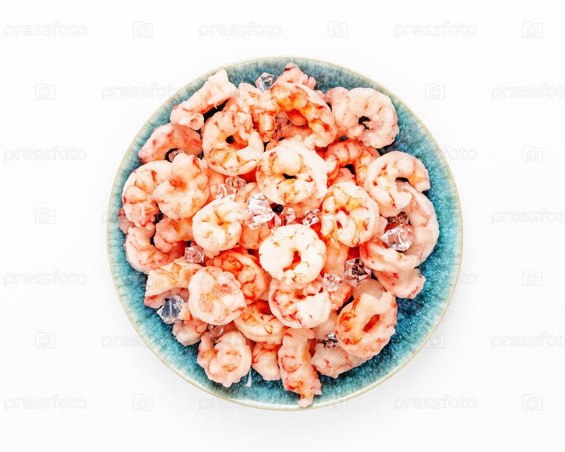 Замороженные креветковые таблетки с кубиками льда на синей тарелке на белом фоне