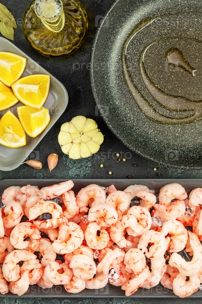 Замороженные креветки-таблетки с кубиками льда, лимоном, оливковым маслом и сковородкой