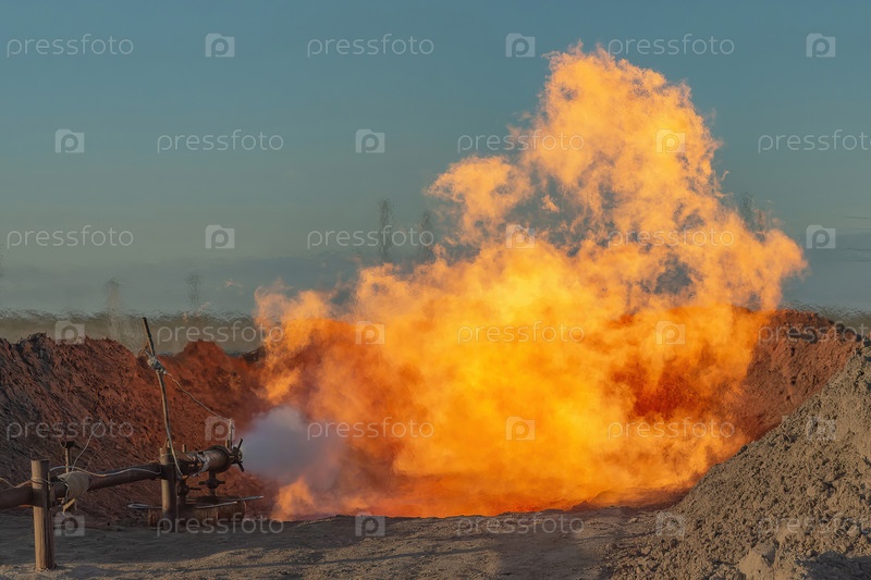 Арктический источник газа. Горящая жидкость резервуара во время испытаний и разработки скважины. Яркий огонь факела как символ энергии и элементов вспыхивает из кишечника