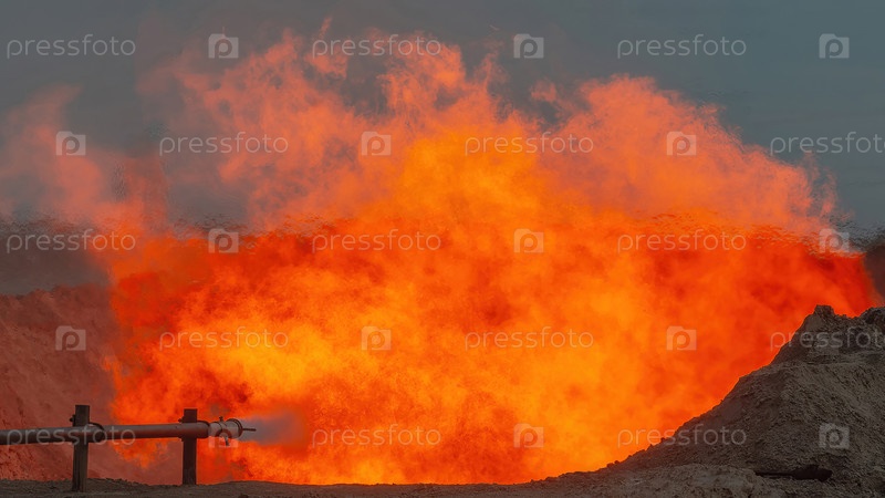 Арктический источник газа. Горящая жидкость резервуара во время испытаний и разработки скважины. Яркий огонь факела как символ энергии и элементов вспыхивает из кишечника