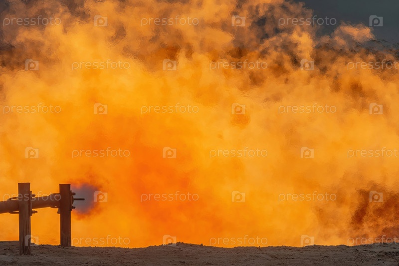 Арктический источник газа. Горящая жидкость резервуара во время испытаний и разработки скважины. Яркий огонь факела как символ энергии и элементов вспыхивает из кишечника