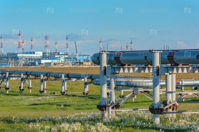 На переднем плане газопровод в летней тундре на Северном поле.На заднем фоне - завод по подготовке газа для транспортировки через основной газопровод