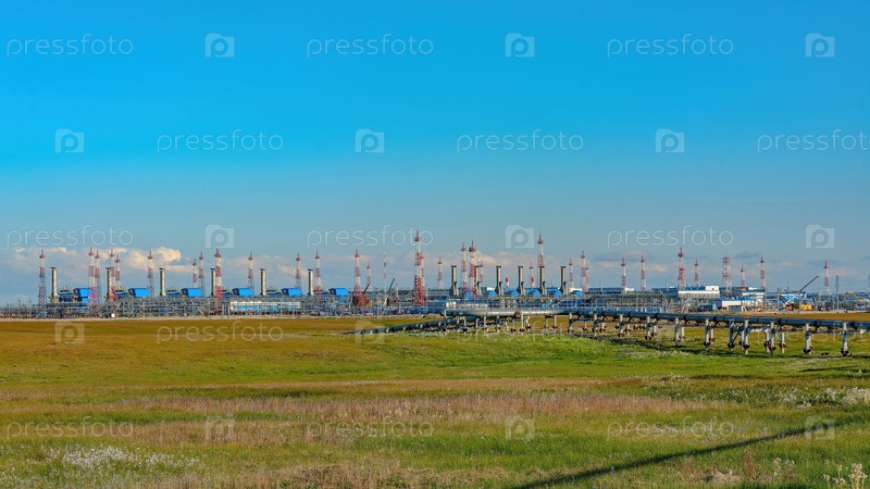 На переднем плане газопровод в летней тундре на Северном поле.На заднем фоне - завод по подготовке газа для транспортировки через основной газопровод