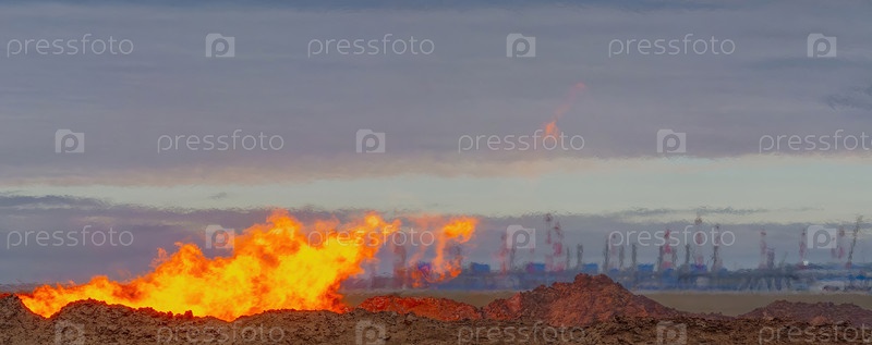 Горящий газовый факел во время разработки скважины.Изображение размыто на заднем плане, поскольку горячий воздух очистной станции газа колеблется для транспортировки