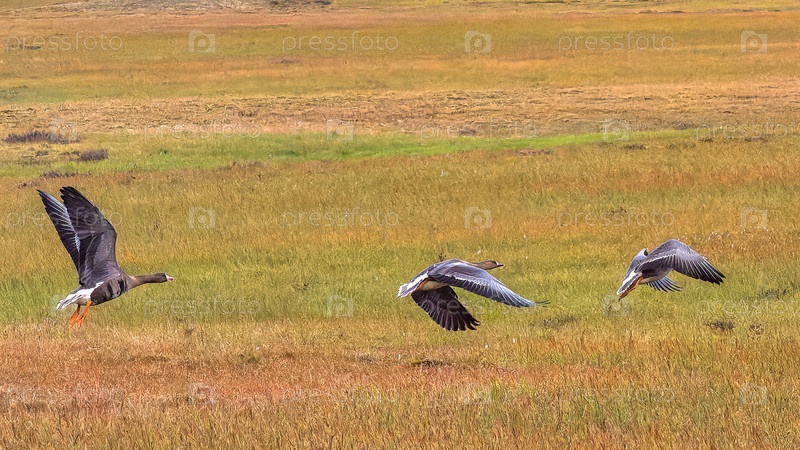 Стадо диких гусей летает над яркой осенней тундрой полуострова Ямал для экологических публикаций, туристических материалов и статей о природе Севера