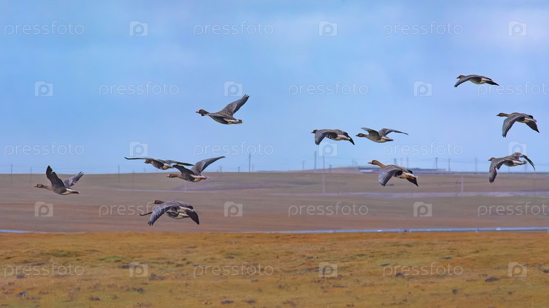 Стадо диких гусей летает над яркой осенней тундрой полуострова Ямал для экологических публикаций, туристических материалов и статей о природе Севера
