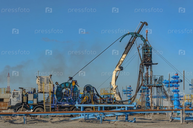 Северное газовое месторождение. Лето. Установка для опускания гибкой трубы в скважину. Оборудование для испытаний и разработки газовых скважин
