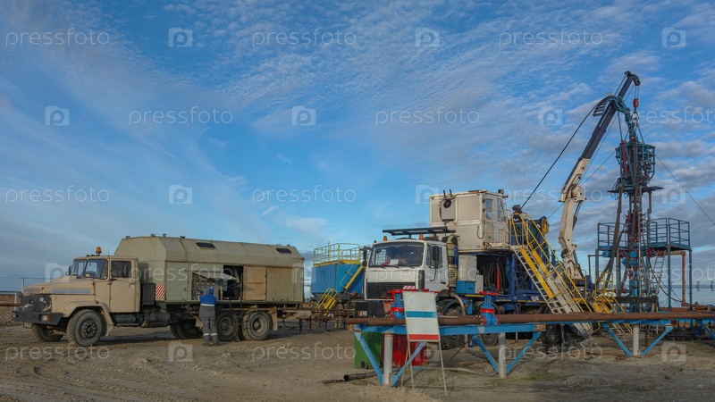 Северное газовое месторождение. Лето. Установка для опускания гибкой трубы в скважину. Оборудование для испытаний и разработки газовых скважин