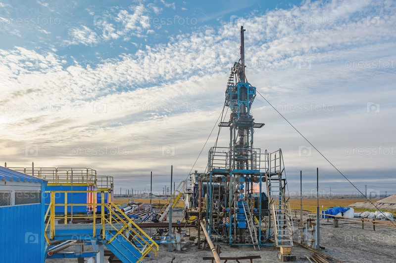 Северное газовое месторождение. Лето. Установка для опускания гибкой трубы в скважину. Оборудование для испытаний и разработки газовых скважин