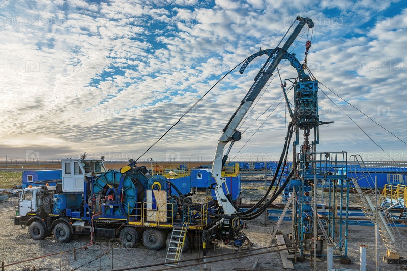Северное газовое месторождение. Лето. Установка для опускания гибкой трубы в скважину. Оборудование для испытаний и разработки газовых скважин