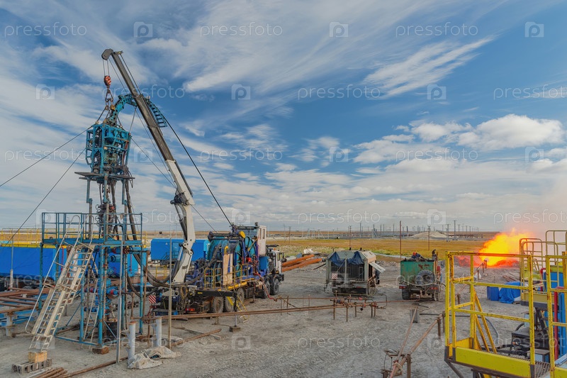 Северное газовое месторождение. Лето. Установка для опускания гибкой трубы в скважину. Оборудование для испытаний и разработки газовых скважин