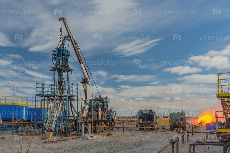 Северное газовое месторождение. Лето. Установка для опускания гибкой трубы в скважину. Оборудование для испытаний и разработки газовых скважин