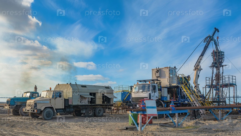 Северное газовое месторождение. Лето. Установка для опускания гибкой трубы в скважину. Оборудование для испытаний и разработки газовых скважин