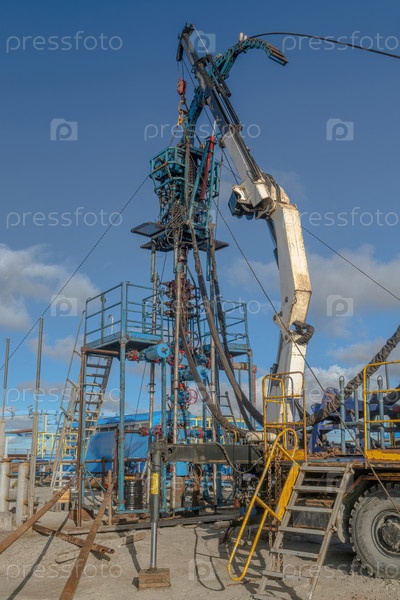 Северное газовое месторождение. Лето. Установка для опускания гибкой трубы в скважину. Оборудование для испытаний и разработки газовых скважин