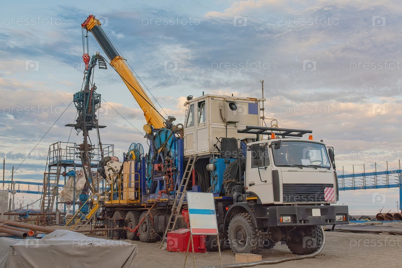 Северное газовое месторождение. Лето. Установка для опускания гибкой трубы в скважину. Оборудование для испытаний и разработки газовых скважин