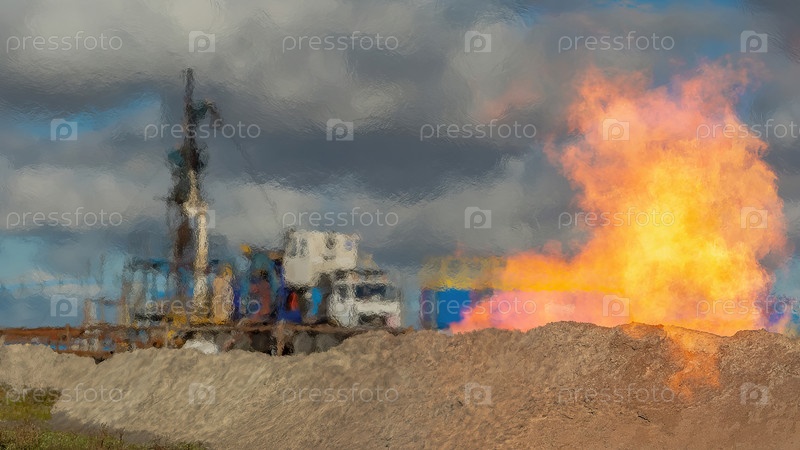 На переднем плане находится мощный факел, когда из скважины выходит горящий газ.На заднем фоне, размытый в жарком воздухе, показана установка для опускания гибкой трубы к шву