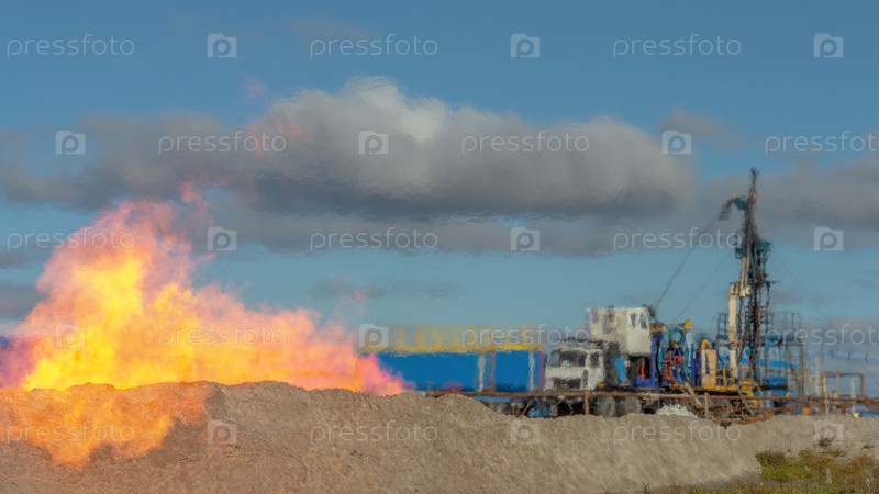 На переднем плане находится мощный факел, когда из скважины выходит горящий газ.На заднем фоне, размытый в жарком воздухе, показана установка для опускания гибкой трубы к шву