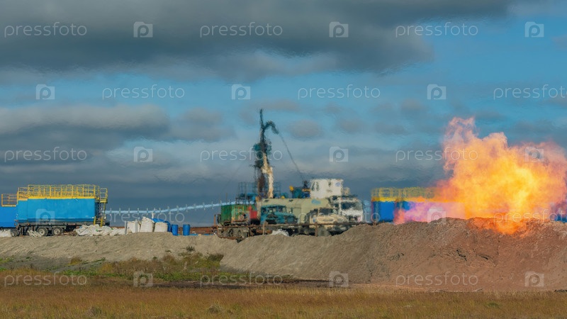 На переднем плане находится мощный факел, когда из скважины выходит горящий газ.На заднем фоне, размытый в жарком воздухе, показана установка для опускания гибкой трубы к шву