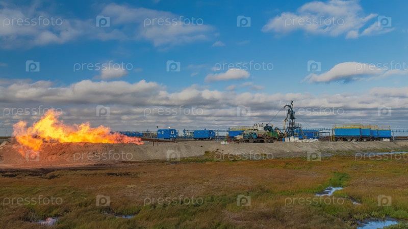 На переднем плане испытывается и разрабатывается газовая скважина, а выхлопные газы сжигаются