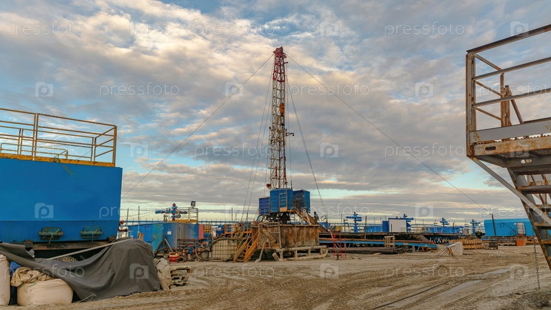 Северное газовое месторождение. Лето. Облачная погода. Инфраструктура площадки по добыче газа. Местоположение объекта