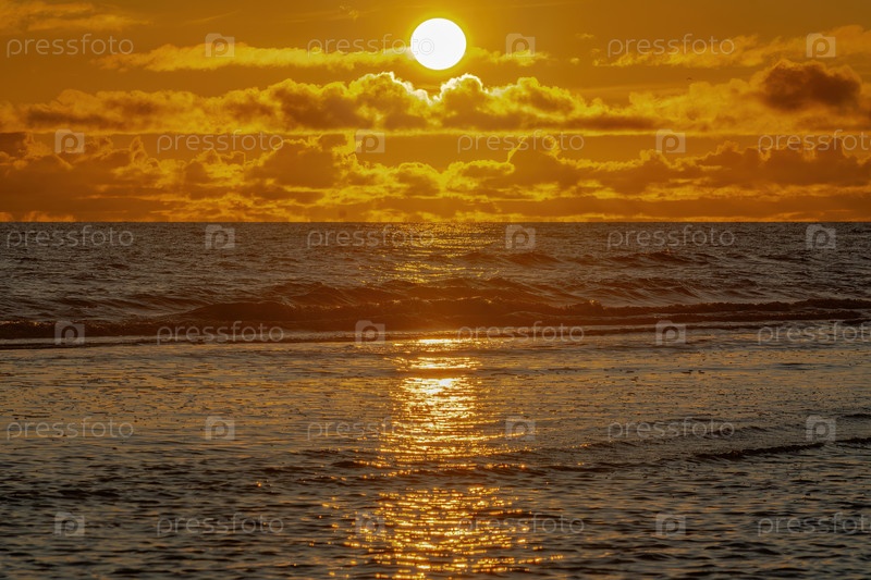 Побережье Северного Ледовитого океана. Лето через полярный круг. Ночь. Красивое облачное небо в свете заходящего солнца. Спокойная поверхность океана