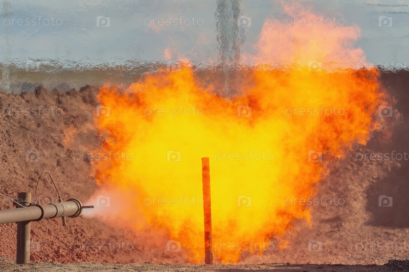Арктический источник газа. Горящая жидкость резервуара во время испытаний и разработки скважины. Яркий огонь факела как символ энергии и элементов вспыхивает из кишечника