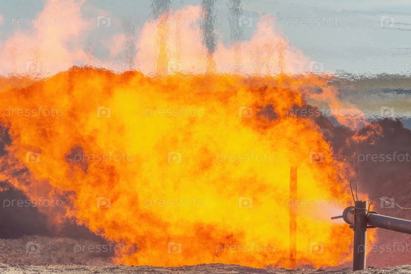 Арктический источник газа. Горящая жидкость резервуара во время испытаний и разработки скважины. Яркий огонь факела как символ энергии и элементов вспыхивает из кишечника
