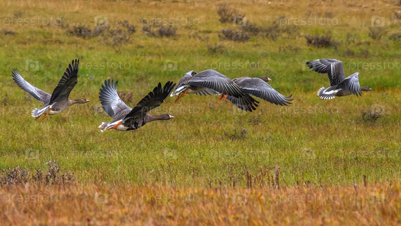 Стадо диких гусей летает над яркой осенней тундрой полуострова Ямал для экологических публикаций, туристических материалов и статей о природе Севера