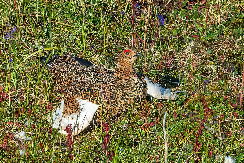 Самка полярной груши в летнем оперении.У самки есть характерная красная бровка над глазом.Птица встревожена вниманием, которое она получает