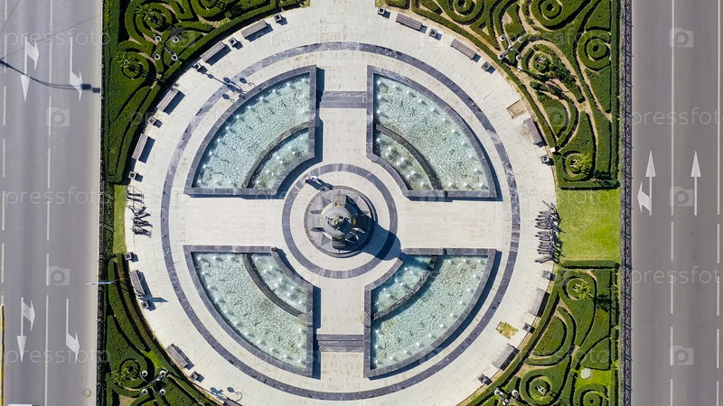 Краснодар, Россия Фонтан у памятника святой Екатерине Площадь Красной улицы Полет над городом летом, вид с воздуха