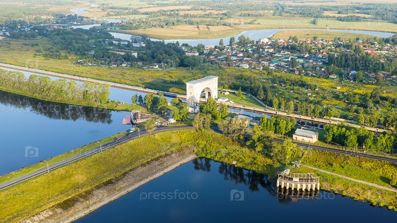 Углич, Россия.Угличский фунтовый замок.Ворота Волги.Раннее утро, взгляд с воздуха