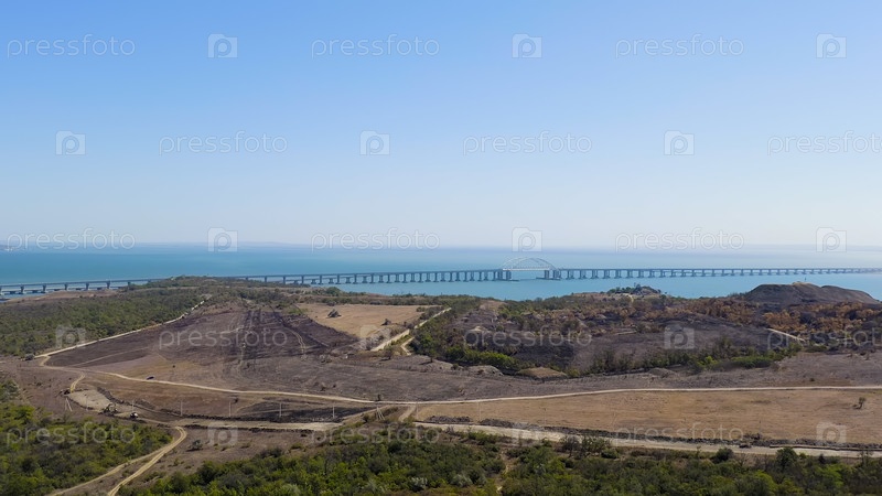 Керчь, Крым. Вид на новый крымский мост. Керченская крепость. Чистая погода, вид с воздуха