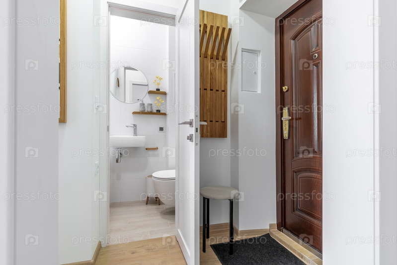 Яркий вход с деревянной дверью и открытым видом на минималистическую ванную комнату с плавучим туалетом и круглым зеркалом