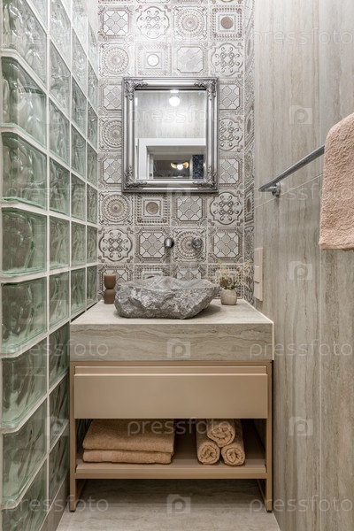Компактная деревенская ванная комната с раковиной из необработанного камня, образцовыми винтажными плитками, обрамленным зеркалом, стеной стеклянных блоков и аккуратно сложенными полотенцами на бежевом тщеславии