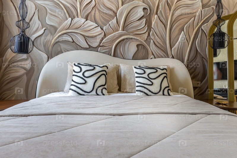 Близкий план современной кровати с мягкими бежевыми постельными принадлежностями, смелыми черно-белыми подушками и потрясающей 3D стеной с рельефным листом