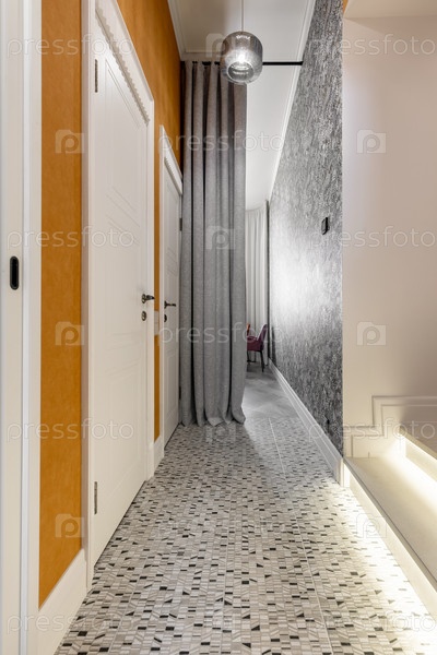 Современный коридор с оранжевой акцентной стеной, геометрическими напольными плитками, белыми дверями и рисунковыми обои ведет к уютной зоне отдыха