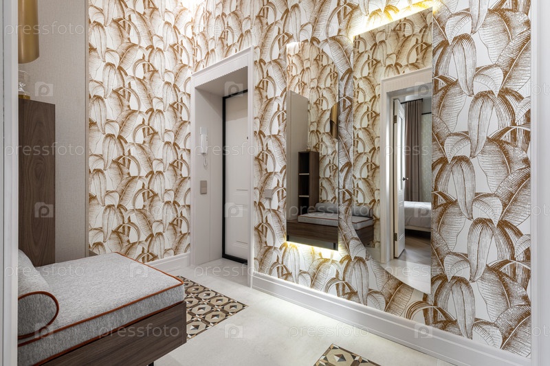 Яркий современный коридор с абстрактными обоями из листового листа, большим декоративным зеркалом, мягкой скамейкой и геометрическими плиточными вставками на полу