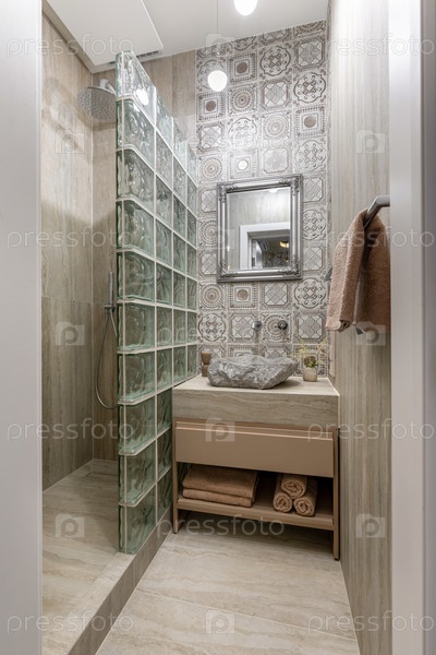 Полный вид на компактную деревенскую ванную комнату с каменным раковиной, винтажными рисунковыми плитками, каркасным зеркалом и душем в окружении зеленых стеклянных блоков