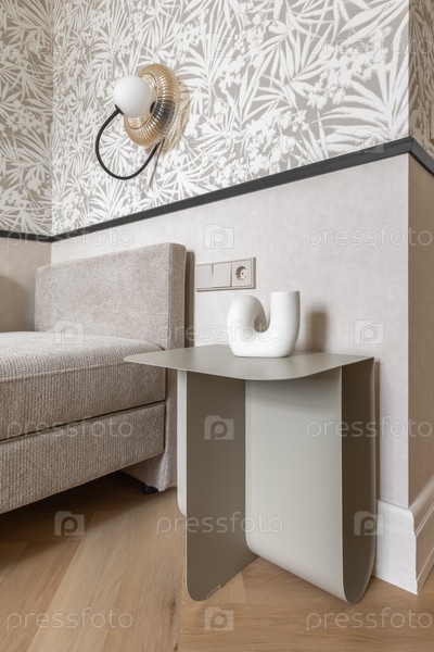 Близкий план уютного угла с бежевым мягким диваном, абстрактным керамическим декором на современном дизайнерском столе и стильной стеновой лампой на рисунке обоев