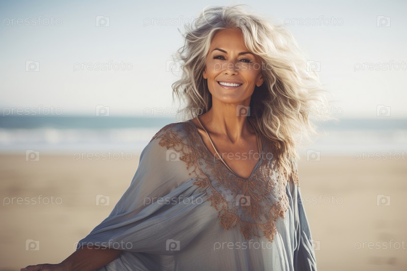 Портрет улыбающейся женщины, завернутой в одеяло на пляже