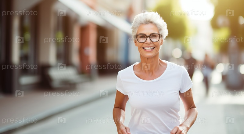 Сохранить форму в 60 лет Женщина средних лет улыбается, бегая по городу