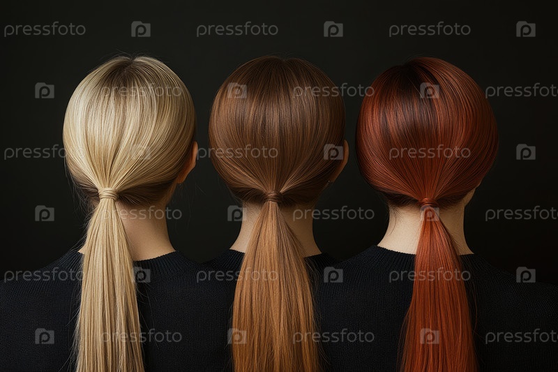 Фотография, показывающая задний вид трех людей с элегантно стилизованными хвостами в светло-коричневых и брюнетных оттенках, подчеркивая разнообразные текстуры волос и эстетику